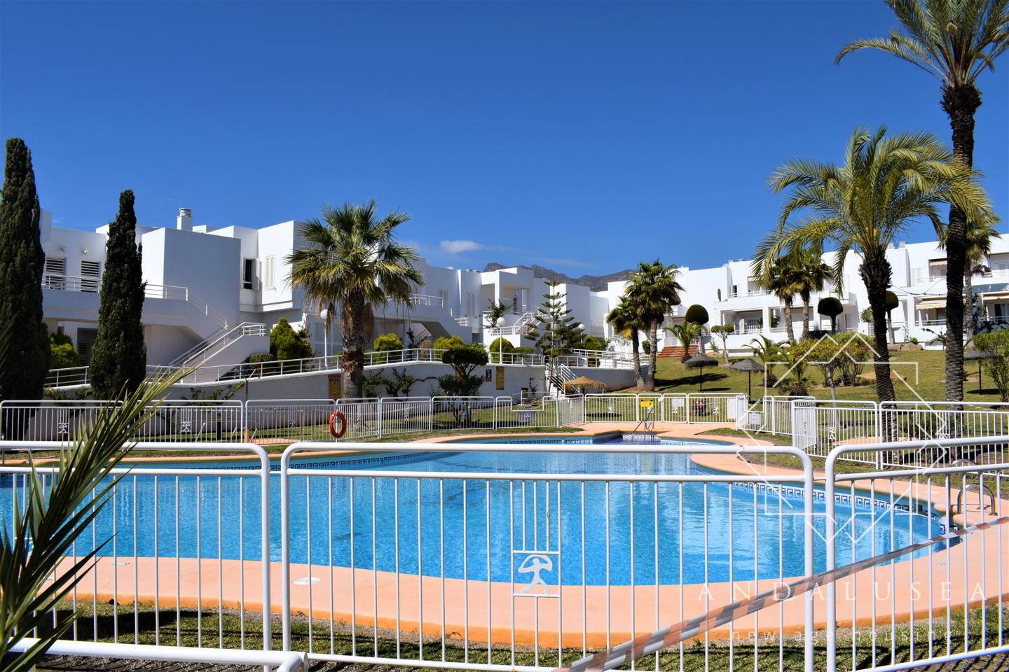 El complejo residencial «Parque Residencial» se encuentra en pleno centro de Mojácar, tiene una preciosas piscina comunitaria con jardín, y está a un paso del Parque Comercial, bancos, Mercadona, y cualquier otro servicio que necesite. Todas las viviendas tienen orientación sur y vistas al mar.